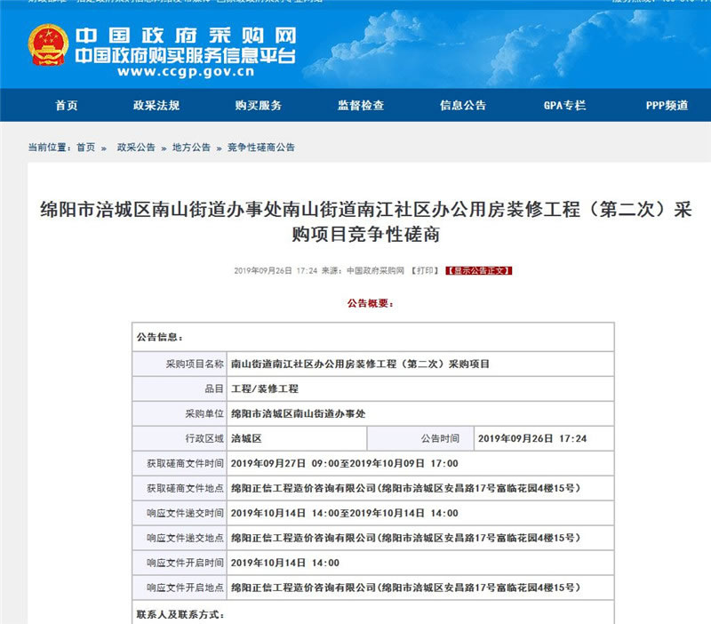 【綿陽正信·招標(biāo)部消息】我公司受綿陽市涪城區(qū)南山街道辦事處委托,對南山街道南江社區(qū)辦公用房裝修工程(第二次)采購項(xiàng)目掛網(wǎng)采購,該項(xiàng)目于2019年09月26日在中國政府采購網(wǎng)掛網(wǎng)公示,預(yù)計(jì)于2019年10月14日14:00在綿陽正信工程造價(jià)咨詢有限公司開標(biāo)室開標(biāo)。