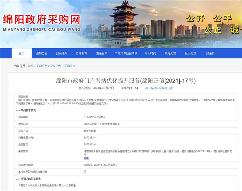 【綿陽正信·招標部消息】我公司受綿陽市政務服務監(jiān)督管理局委托,對綿陽市政府門戶網(wǎng)站優(yōu)化提升服務擬采用競爭性磋商方式進行采購,本項目于2021年05月27日在四川省政府采購網(wǎng)及綿陽市政府采購網(wǎng)公示,預計于2021年06月07日10:00在綿陽市安昌路17號富臨花園四樓15號開標。