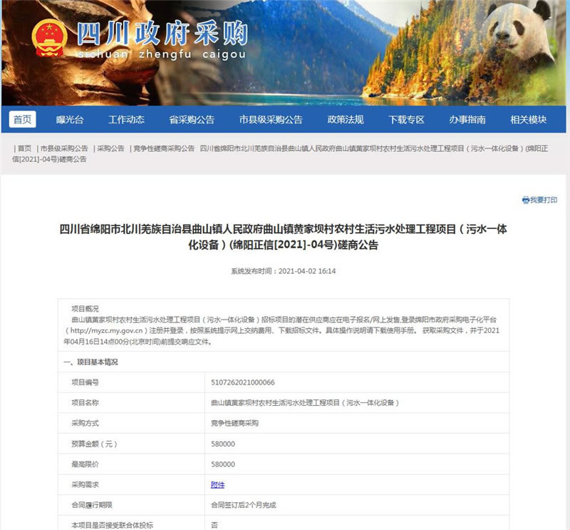 【綿陽正信·招標部消息】我公司受北川羌族自治縣曲山鎮(zhèn)人民政府委托,對曲山鎮(zhèn)黃家壩村農村生活污水處理工程項目(污水一體化設備)(第二次)擬采用競爭性磋商方式進行采購,本項目于2021年06月09日在四川省政府采購網及綿陽市政府采購網公示,預計于2021年06月21日14:00在綿陽市安昌路17號富臨花園四樓15號開標。