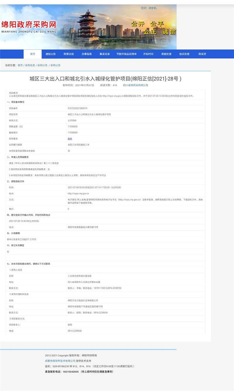 【綿陽正信·招標部消息】我公司受三臺縣住房和城鄉(xiāng)建設(shè)局委托,城區(qū)三大出入口和城北引水入城綠化管護項目擬采用公開招標方式進行采購,本項目于2021年07月07日在四川省政府采購網(wǎng)公示,預(yù)計于2021年07月28日13:30在綿陽市安昌路17號富臨花園四樓15號開標。