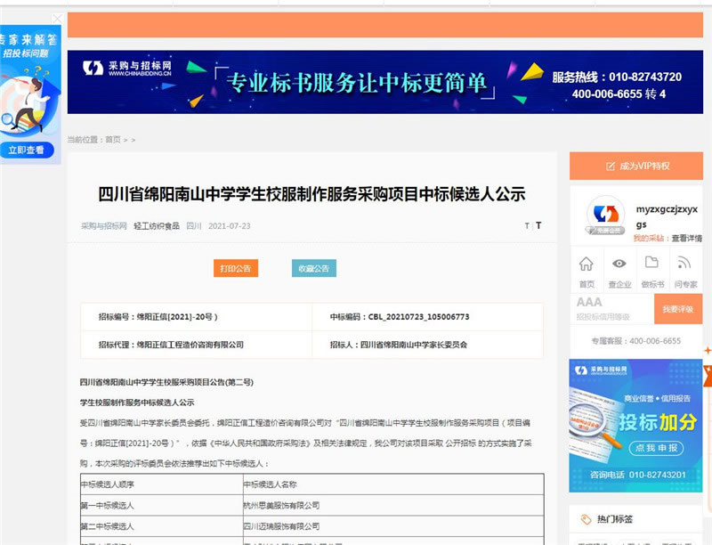 【綿陽正信·招標(biāo)部消息】我公司受四川省綿陽南山中學(xué) 四川省綿陽南山中學(xué)家長委員會(huì)委托,對四川省綿陽南山中學(xué)公開征集學(xué)生校服設(shè)計(jì)基礎(chǔ)款式采購項(xiàng)目擬采用公開招標(biāo)方式進(jìn)行采購,本項(xiàng)目于2021年06月27日在中國采購與招標(biāo)網(wǎng)掛網(wǎng)公示,于2021年07月22日14:00在綿陽科創(chuàng)區(qū)劍南路西段388號長興星城3棟2樓11號順利開標(biāo)。